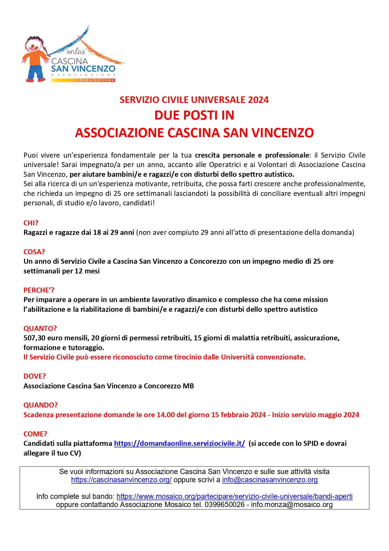 SERVIZIO CIVILE 2024 in CASCINA SAN VINCENZO